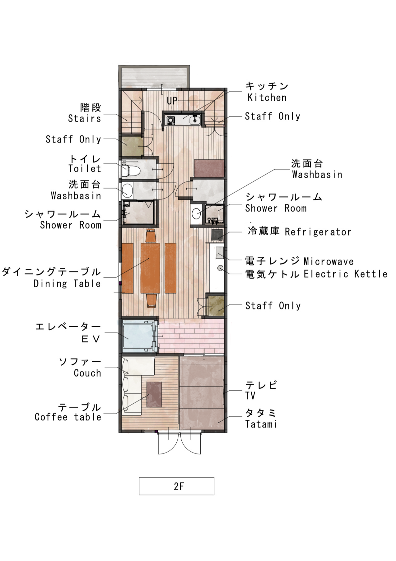 2階ダイニングには、大きなテーブルとベンチを設置。皆で集まって、ゆっくりと腰掛けながらグループの時間を楽しんでいただけます。