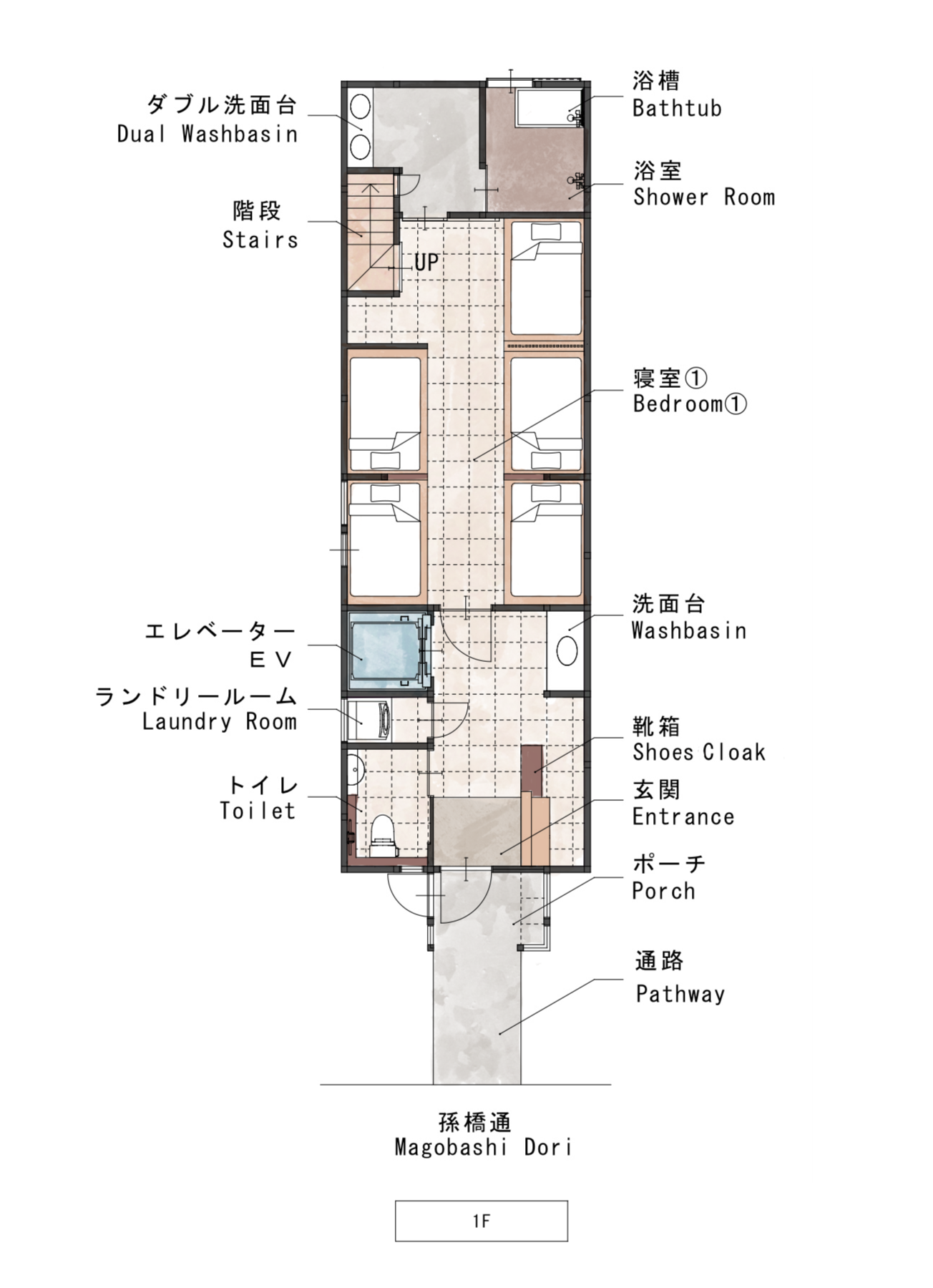 トイレは各階に設置しており、すべてウォシュレット付きとなっております。浴室は1つ、シャワー室が2つ、洗面台は4つあります。1階の浴室には湯船も備わっており、日本の暮らしに欠かせない”お風呂文化”を感じながら、のんびりとしたバスタイムをお楽しみいただけます。